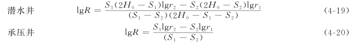 实际工作中,常用多孔抽水试验资料确定影响半径。如在一个抽水井中抽水,在其周围布置一定数量的观测孔,观测其水位下降值,然后利用裘布依公式计算R。采用两个观测孔的资料时: