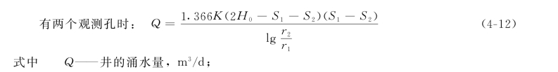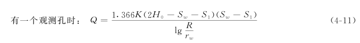 当抽水井附近有一或二个观测孔时,改变积分上、下限,可得下列涌水量公式: