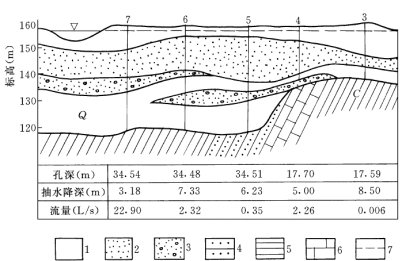 1—粘性土;2—砂;3—砂砾石;4—砂岩;5—页岩;6—石灰岩;7—地下水位