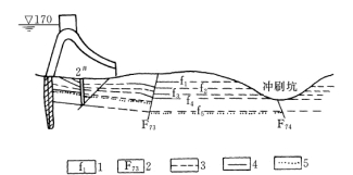 图5-8 河床冲刷坑对坝基(肩)稳定的影响(湖南双牌工程6~7 号支墩地质纵剖面)