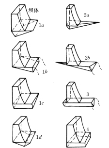 坝基岩体在切割面、滑动面和临空面的分割包围下,可形成各种形状的滑动体,常见的有楔形体、锥状体、棱柱体、方块体和板状体等(图5-9)。