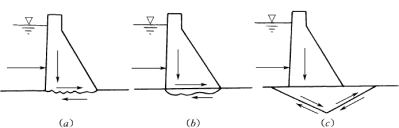 (3)深层滑动指发生在坝基岩体较深部位的滑动,如图5-6(c)。主要是沿软弱结构面发生滑动,局部地方也可发生剪切破坏。深层滑动是高坝需要研究的主要工程地质问题。