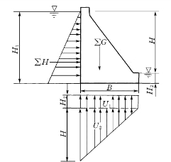 H——计算剖面范围内各种水平力之和(主要是库水的水平推力、泥沙侧压力、地震惯性力等),kN;