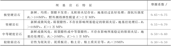 表5-2 混凝土坝基岩体摩擦系数(f)经验数据表