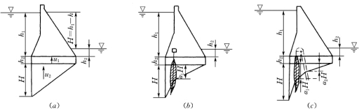 (a)无阻水及排水设施;(b)有阻水帷幕;(c)有阻水帷幕和排水设施H—作用水头(H=h1-h2);u1—浮托力;u2—渗透压力