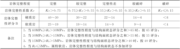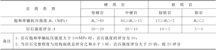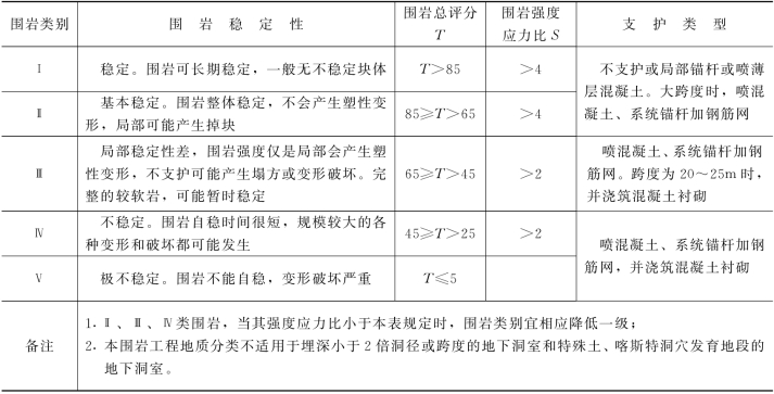 在生产实践中,通常选择几条洞线方案,经过工程地质勘察,比较不同方案的优缺点,最后选择一条最优方案供实施。隧洞在选线或设计方案比较时,常用围岩分类方法。表5-3 是我国水工隧洞围岩工程地质分类方案,可供参考。此分类方案以控制围岩稳定的岩石强度、岩体完整程度、结构面状态、地下水和主要结构面产状五项因素之和的总分为基本判据,围岩强度应力比为限定判据,其计算公式为