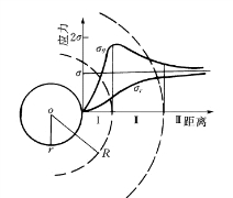 Ⅰ—松动圈(应力降低区);Ⅱ—承载圈(应力升高区);Ⅲ—天然状态圈(原始应力区)σ—初始应力;σr—径向应力;σθ—一切向应力