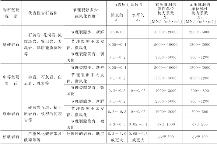 围岩的弹性抗力系数可通过野外试验直接测定。中小型工程常用经验数据来确定。表5-10 中所列的K0 值,是我国水利电力部门总结已建成隧洞的经验值,可供参考。