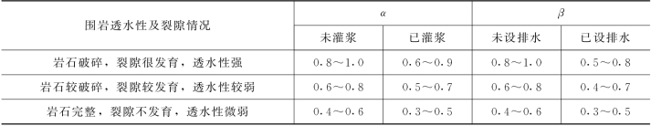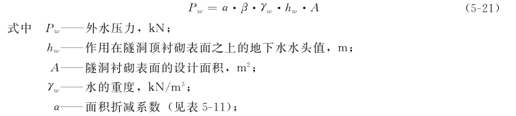 外水压力是指作用在隧洞衬砌上的地下水静水压力。其大小主要由隧洞围岩的水文地质条件(如水位的埋深、压力水头的大小、岩石的透水性等)和隧洞设计及施工情况所决定。工程实践证明,作用在衬砌上的外水压力并不都等于其全部水头值,外水压力实际作用面积也不等于全部衬砌面积,所以计算外水压力时需将二者折减,即