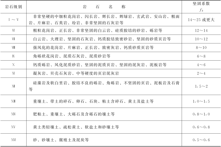 常见岩土的坚固系数经验值列于表5-9 中,可供参考。