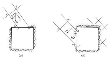 (1)洞顶为楔形分离体或方柱分离体如图5-16(a)、(b)。此时易形成洞顶坍方,在不考虑软弱结构面的强度时,则沿洞轴单位洞长上的山岩压力为(2)洞顶或洞壁为斜方柱分离体如图5-17(a),(b)。此时洞顶或洞壁易产生滑坍,计算时主要考虑滑动面(cd面)的抗滑稳定性和山岩压力的作用方向,其计算公式为