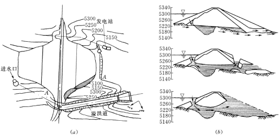 (1)纵谷是河流沿岩层走向发育,这时岩层走向与坝轴线垂直,不论是坝基或坝肩,如有渗漏岩层或顺河流方向断层,都可构成良好渗漏通道,特别是坝肩上、下游有沟谷地形时(图5-21 中的A-B剖面),则更易形成库水的大量渗漏。在河谷纵剖面上,沿层面渗流途径最短,有利于库水向邻谷绕坝渗漏;而在河谷横剖面上,一侧坝肩渗入良好,而排泄不利,另一侧坝肩则顺层面渗漏严重。由于纵谷条件下的渗漏通道是顺河流方向的,所以即使坝轴线向上游或向下游调整移动,也很难避免沿透水岩层走向方向的渗漏。