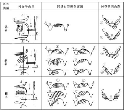 (3)斜谷是河流与岩层走向斜交,这时岩层走向与河水流向间夹角的大小,是影响渗漏的重要因素。一般夹角越小,且岩层倾向偏向下游时,产生坝基或坝肩渗漏的可能性越大。