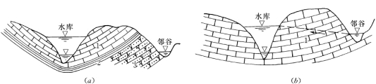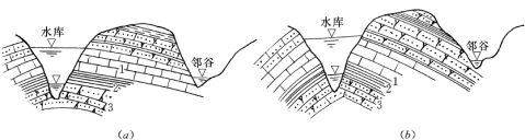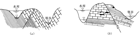 (a)透水岩层倾角较小,且被邻谷切割出露,可能导致库水向邻谷的渗漏;(b)透水岩层倾角较大,未在邻谷中出露,不会导致库水向邻谷的渗漏
