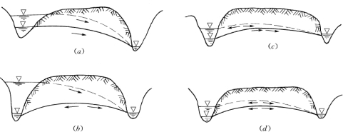 库区河间地块地下水的存在与否、水位高低,以及地下水位与水库水位和邻谷水位三者之间的关系,是判断水库是否渗漏的重要条件,如图5-26 所示。有下列四种情况: