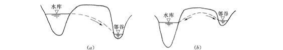 山区水库,如四周山体单薄,邻近有低谷或洼地,且其底面标高低于水库正常水位,则从地形上创造了渗漏的有利条件。当有渗漏通道时,库水便会不断地排向邻近低谷造成渗漏。邻谷切割得越深,与库水位高差相差越大,渗漏量也越大,如图5-22(a)。反之,如邻谷切割不深,谷底高程高于水库正常水位时,就不会产生向邻谷的渗漏,如图5-22(b)。