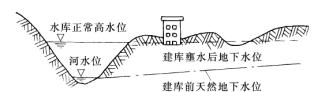 水库蓄水后,由于库水位抬高,使库岸周围地区岩土浸湿饱和,地上水位也随之上升,这时地下水位可能接近或高出地表,导致库岸地带土壤盐碱化、沼泽化,建筑物地基恶化,矿坑充水坍塌,这种现象称为库区浸没,如图5-28 所示。水库浸没会给水库周边地带的工业民用建筑、交通运输、农田、矿坑带来危害,因此,在库区、坝址选择与坝高、水库正常水位确定中都应十分重视对水库浸没问题的调查研究。