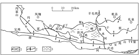 1—引地表水灌溉的干渠;2—地表水与地下水的补排关系;3—扶风灌区渍水灾害地段