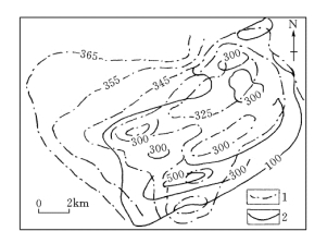 1—承压水位1985 年等值线(m);2—地面沉降1980~1985 年等值线(mm)