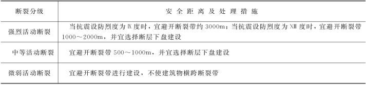 区域稳定性,就是工程所在地区较大范围内地质构造与地壳活动的稳定程度。重点是了解新构造运动和地震活动的规律。一般通过卫星摄影和航空照片判释、地壳结构探测、地震台网和地形变形观测点的监测分析,以及断层活动性的调查等,来分析地壳结构特征、区域构造应力场、活断层与地震的时空分布规律,从而了解该区地壳的稳定程度。在选择坝址时,要确定坝址区的地震烈度,尽量避开发震断裂,将坝址选择在相对稳定安全的地方。一般坝址不宜选在震级为6.5 级以上的震中区或地震基本烈度为Ⅸ度以上的强震区;大坝等主体工程不宜建在已知的活断层及与之有构造活动联系的分支断层上。重大工程与断裂的安全距离及处理措施见表5-12。