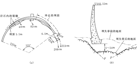 (a)马尔帕塞坝位移情况剖面图;(b)马尔帕塞坝左坝头附近断面图