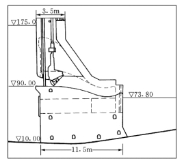 重力坝常用混凝土或浆砌石筑成,它的基本剖面呈三角形,如图5-34 为长江三峡混凝土重力坝溢流坝段剖面图。重力坝主要依靠坝体自身重量来维持稳定,坝体越重越有利于稳定。因此它对地基地质条件要求较高,即坝基岩体要有足够的抗压强度(表5-13),以承受由坝体传来的巨大荷载;要有足够的抗剪强度,以防止滑动破坏;要有良好的隔水性能,防止坝下渗流产生过大的渗透压力。一般选择新鲜或微风化的坚硬岩体作为重力坝的坝基,要尽量避开不利于稳定的各种软弱结构面。两岸山坡岩体稳定,无滑坡、崩坍、冲沟等不良地质现象。重力坝适合于宽而浅的河谷,坝址下游河床抗冲能力要强,以防止坝顶溢流时水流的冲蚀。由于大坝施工所需混凝土数量较大,坝址附近应有合适的砂砾石或碎石等混凝土骨料。