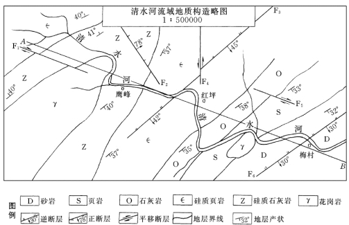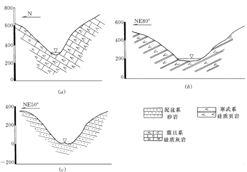 在清水河流域规划阶段,曾考虑了多级开发和一级开发方案,根据区域地质条件(图5-37),选择了鹰峰、红坪和梅村三个坝段,各坝段的地形地质剖面如图5-38 所示。其主要工程地质条件列于表5-14 中。通过对各坝段地形地貌、地层岩性、地质构造及其他条件的综合比较,可以看出梅村坝段建坝兴库条件比较优越,混凝土骨料在梅村上游10km、粘性土在梅村上下游50km范围内,数量、质量均能满足工程需要,故选定该坝段为一级开发方案。