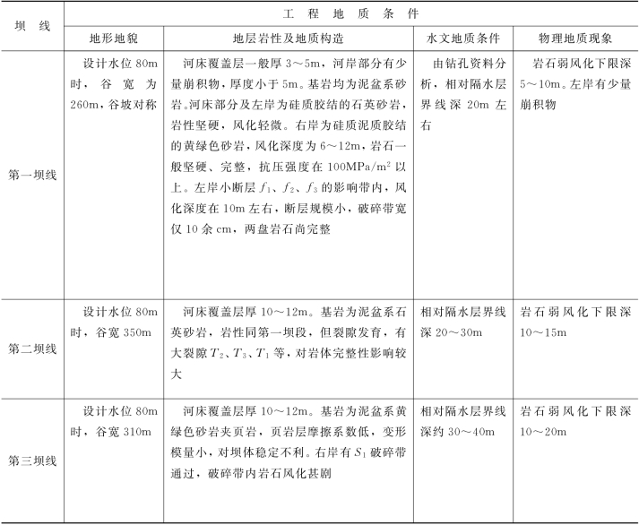 在初步设计第二阶段,对梅村坝址区进行了1∶10000 的工程地质勘察,清水河水库梅村坝址区工程地质图见附图二。选择第一、第二、第三坝线进行比较。通过工程地质勘探及试验,获得各坝线的工程地质条件列于表5-16 中。经过分析比较,第一坝线河谷宽度小,覆盖层厚度薄,风化带深度浅,坝区岩石为坚硬完整的砂岩,故选定第一坝线为最优坝线。