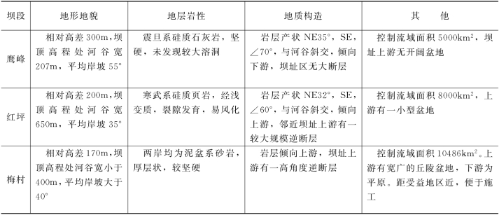 表5-14 鹰峰、红坪、梅村、坝段主要地质条件比较
