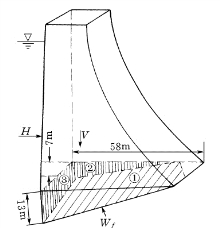 5-14 江西上犹江水电站为溢流式混凝土重力坝,坝内式厂房,由10 个坝块组成,如图5-40 所示,其中丙块至庚块坝段为溢流段。坝高68m,顶宽19m,底宽58m,坝顶长143m。坝址区为深切河谷,河水自北向南流。