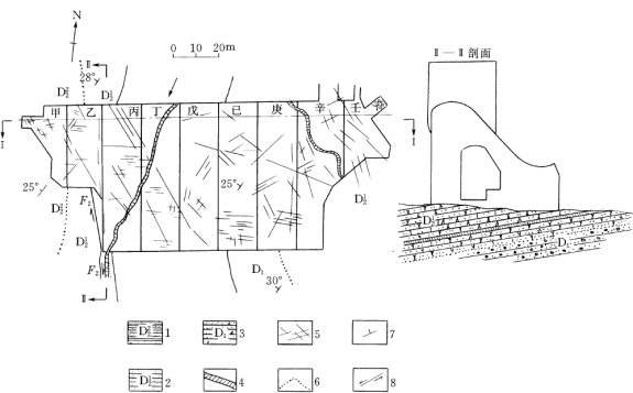 1—中泥盆统紫色砂岩与板岩互层;2—中泥盆统砾状石英砂岩夹板岩;3—上泥盆统石英砾岩;4—板岩破碎泥化夹层;5—裂隙(节理);6—岩层界线;7—岩层产状;8—断层