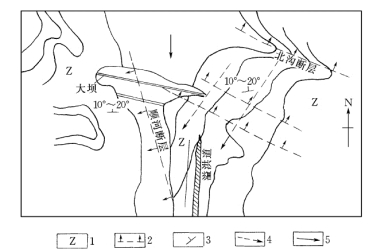 5-10 图5-39 为河北某水库平面图,坝库区为震旦系硅质灰岩,岩层倾向上游,倾角10°~20°。在坝基下有一顺河断层,左坝肩岩体内除发育一组走向NE20°的小断层外,还有一组走向NW、倾向NE的断层。试分析坝区可能存在的渗漏问题。