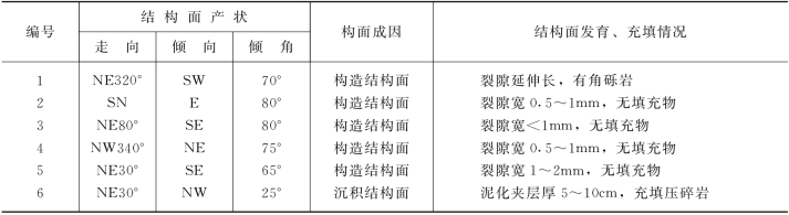 紫色砂岩与板岩互层。岩层走向NE30°,倾向NW,倾向上游偏右岸,倾角25°,顺河方向的视倾角为14°。坝基石英砂岩中有一板岩夹层,厚10~80cm,在地下水的作用下,顶部已形成厚5~10cm的泥化夹层,强度较低,现场抗剪试验测得摩擦系数f=0.24~0.3,粘聚力C=8~13kPa。除此沉积结构面外,岩体内还发育有5 组构造结构面,如表5-18 所示。