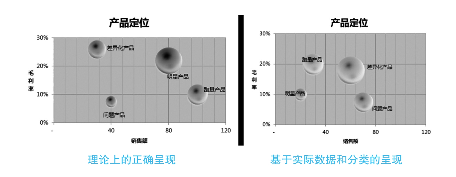 必须先解决这一团数据乱麻。我让他们每个人按照他们的想法,把他们以为的跑量产品、明星产品、差异化产品和问题产品的标签分别贴到每一个规格的型号上,然后我们整合了他们内部的各种系统,打造了一个大致有七八成准确率的数据库。之后我们开始做气泡图:横轴是销售额,纵轴是毛利率,气泡大小代表毛利额。