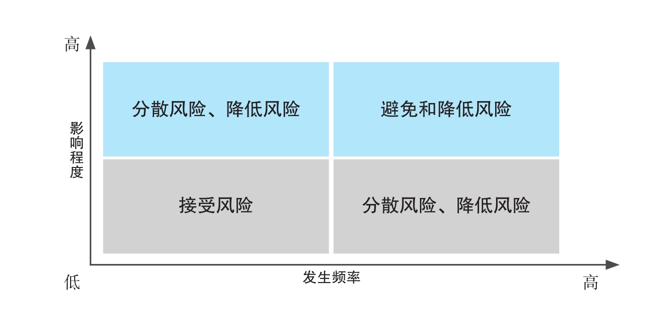 应对风险时,我们常见的做法有接受风险、避免风险、降低风险和分散风险四种类型。