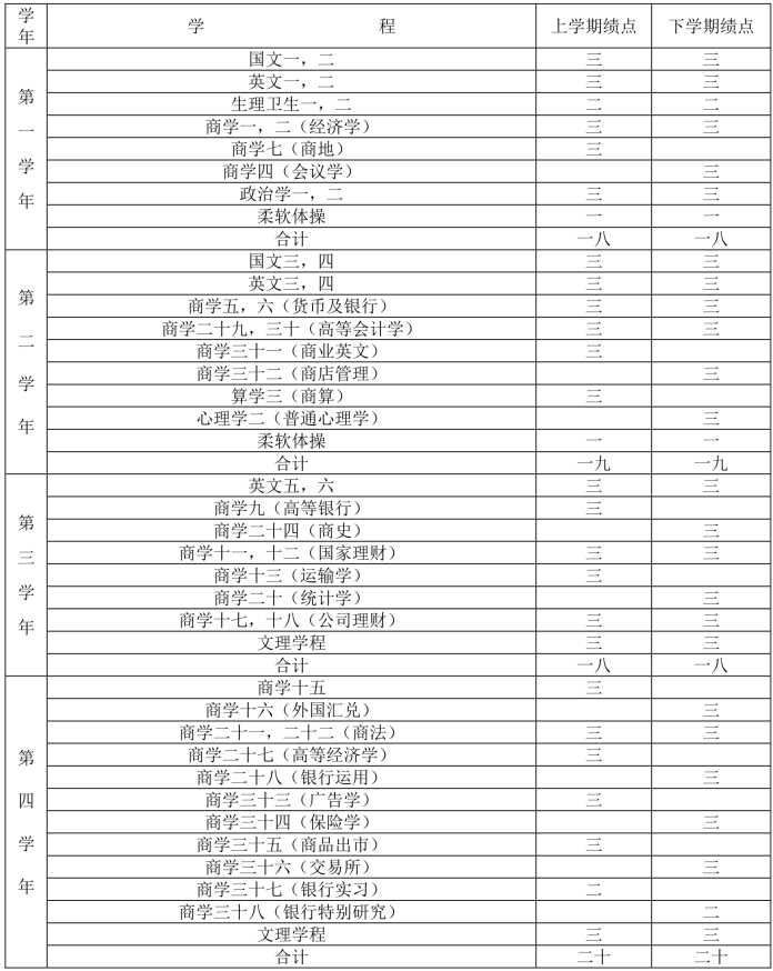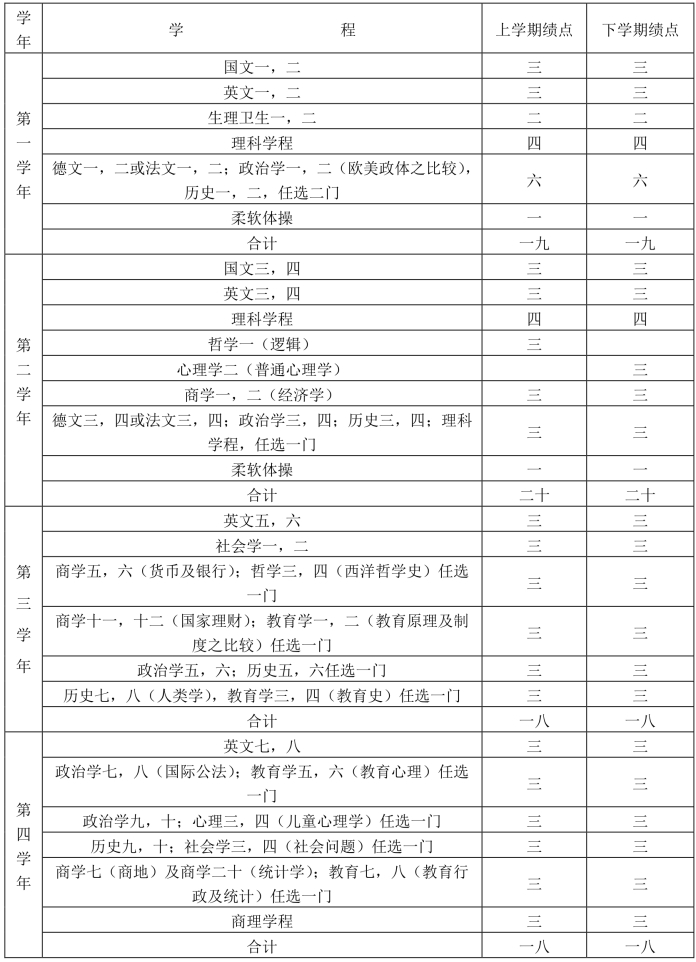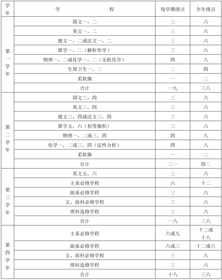 5.课程。其第三、第四学年必修、选修之学程,表中未经详列细目者,须于开学时向该科主任或该系主任商定之。