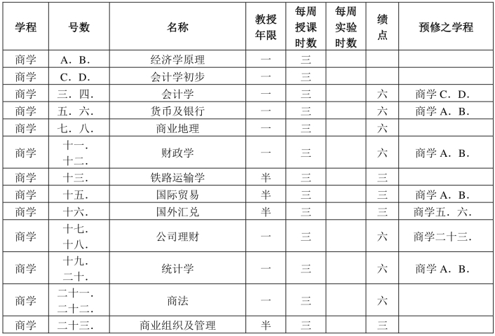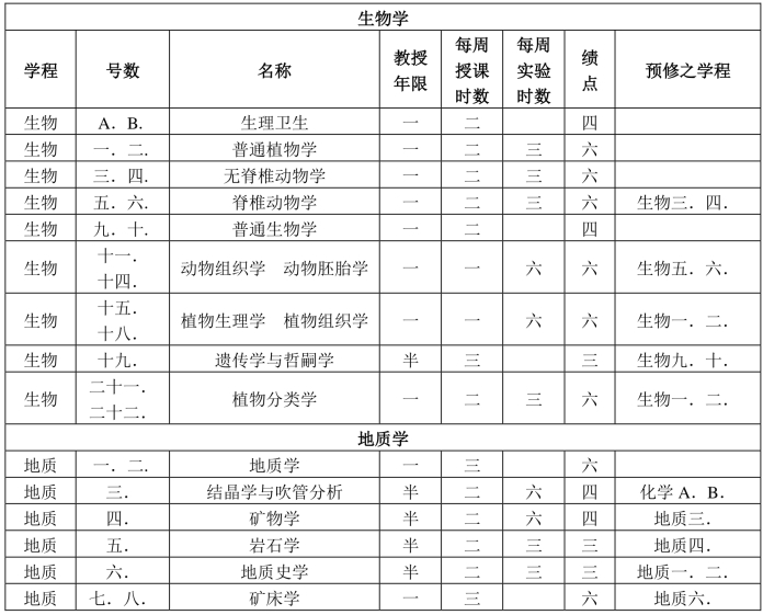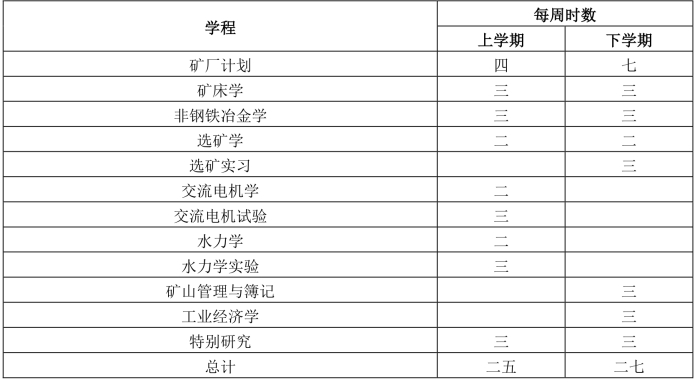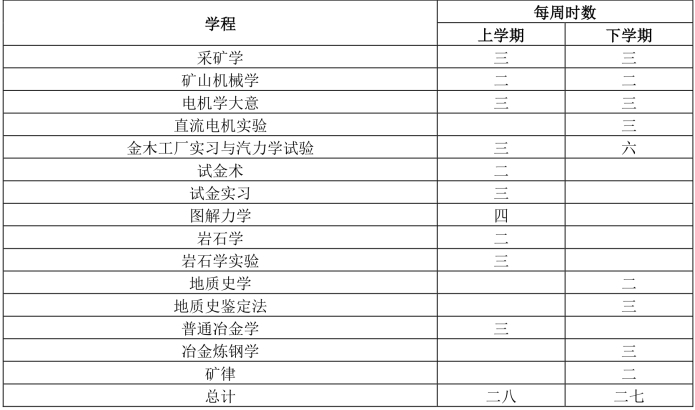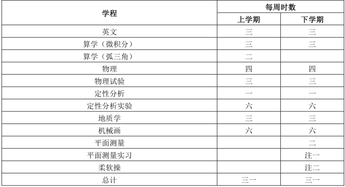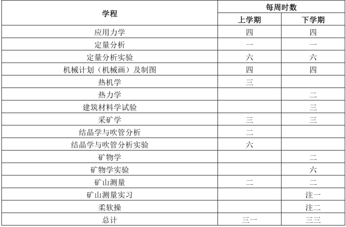 注一:平面测量实习于暑假期内至著名矿山附近举行,共六星期。