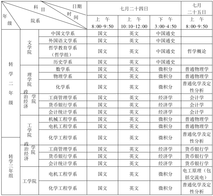 (壹)本校本年度在天津、重庆两处招收下列各院系二、三年级转学生。