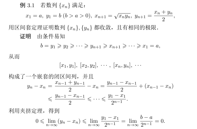 从而上述的闭区间列构成了一个区间套.利用区间套定理,得到数列{xn},{yn}都收敛,且有相同的极限.