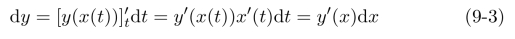 因此,从形式上来看,不管y=f(x)中的x是否真正的自变量,式(9-2)与式(9-3)是一样的,即一阶微分的形式是不变的.