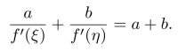 习题10.12 设函数f(x)在闭区间[0,1]上连续,在开区间(0,1)内可导,且f(0)=0,f(1)=1.试证明:对于任意给定的正数a和b,在开区间(0,1)内存在不同的ξ和η,使得