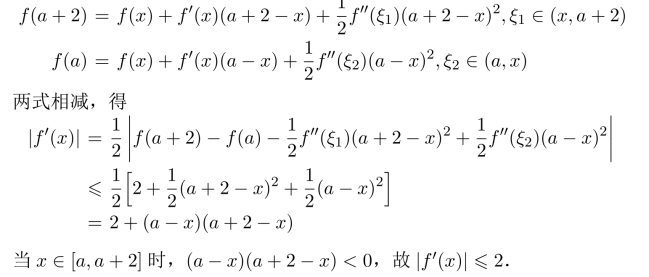 例11.10 设函数f(x)为区间[a,a+2]上的函数,且|f(x)|≤1,|f′′(x)|≤1,证明|f′(x)|≤2,x∈[a,a+2].