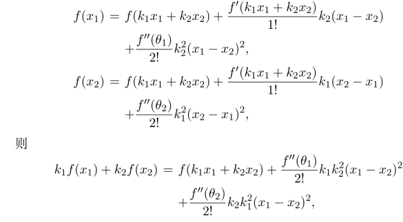 方法一,由于函数下凸,故f′′(x)>0.对函数f(x1)和f(x2)在k1x1+k2x2处做Taylor展开,得