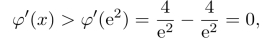所以当x>e时,φ′′(x)<0,故φ′(x)单调减小,从而当e<x<e2时,