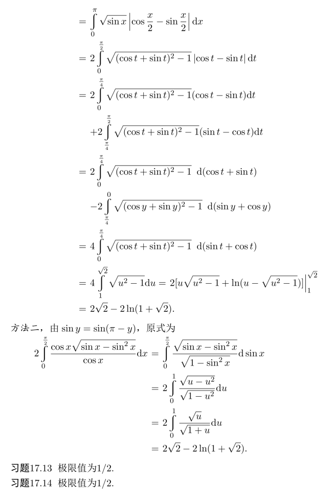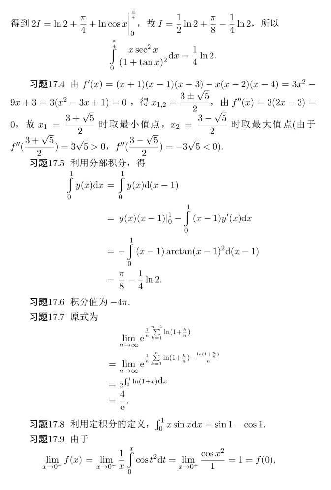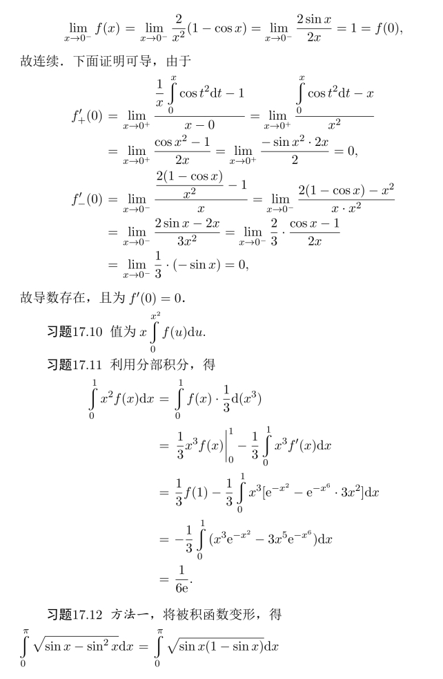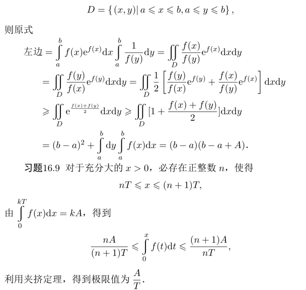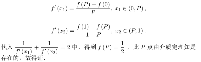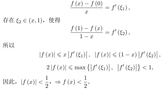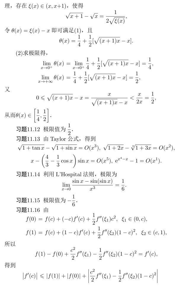 习题16.11 由积分中值定理,存在η∈(0,2/π),使得ef(η)arctanη=π/4,令F(x)=ef(x)arctanx,则由微分中值定理,存在ξ∈(η,1),使得F′(ξ)=0,得证.
