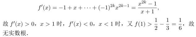 当x∈R时,f′(x)<0,故f′(x)单调减少,又f(0)=1,f(x)<0,当x>1时,故存在唯一实根.