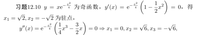 习题17.15 计算函数的一阶导数和二阶导数,可得单增区间(−1,0)∪(1,+∞),单减区间为(−∞,−1)∪(0,1),极小值f(−1)=f(1)=0,极大值f(0)=1/2−1/(2e).