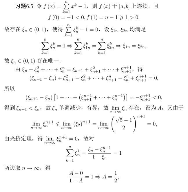 习题6.2 由于f(x)于(0,1)内连续,且f(0)=−1<0,f(1)=n≥1>0,故存在x1∈(0,1),使得f(x1)=0,且当x>1时,不可能有xn+nx−1=0,故正数解x1∈(0,1),设有两个解x1,x2,则