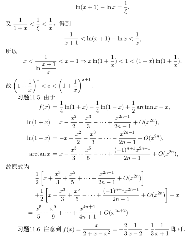 习题11.4 (1)设f(x)=lnx,在[1,x]上利用Lagrange中值定理,存在ξ∈(1,x),使得