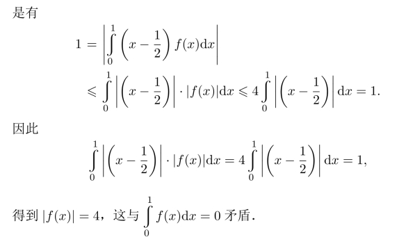 (2)仍然使用反证法,只需要证明存在x1∈[0,1],使得|f(x1)|<4即可.如若不然,则必有f(x)≥4或者f(x)≤−4成立,这与矛盾.再由连续性及(1)的结果,利用介值定理,可以得到(2)的证明.